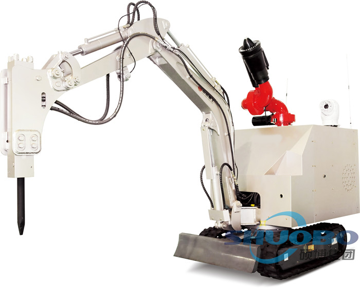 機器人擁有可回轉(zhuǎn)塔臺和三關(guān)節(jié)式強力破拆錘,可完成較大作業(yè)半徑的破拆工作,便于消防救援工作的開展。機器人搭載120L/s大流量消防炮,水帶拖行能力強,對大型火災(zāi)的迅速撲救工作尤為擅長。