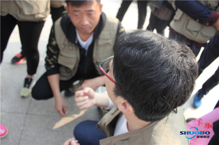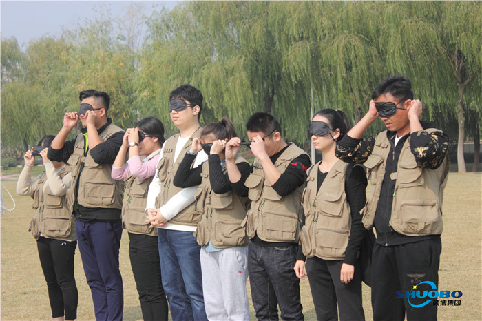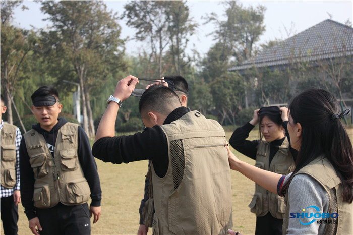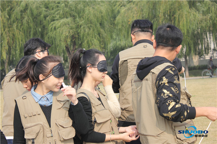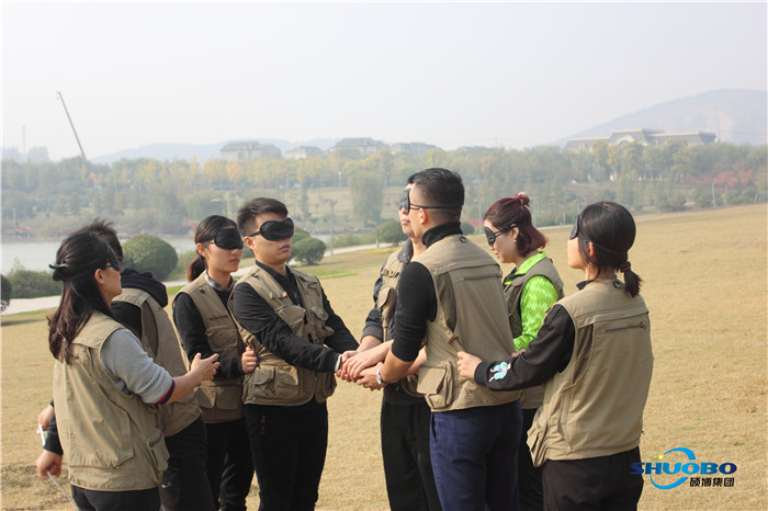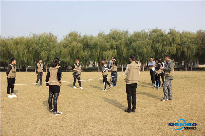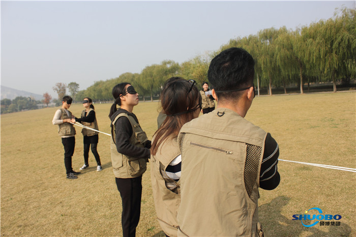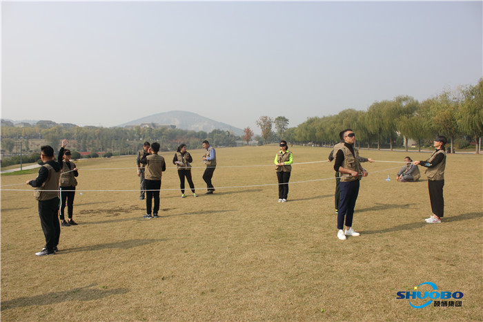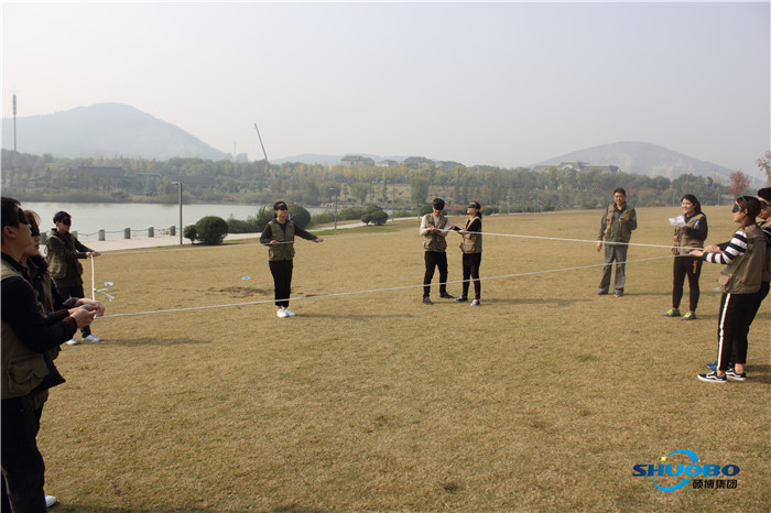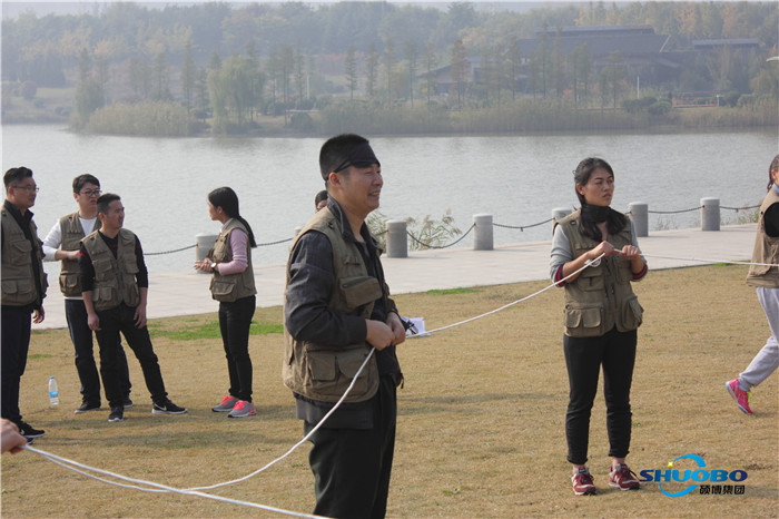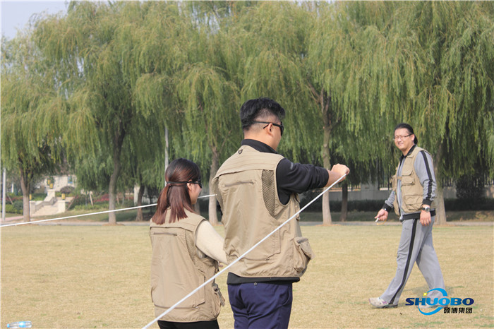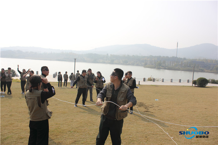 首先是“盲人方陣”??简炄绾卧谛畔⒉怀浞值臈l件下尋找出路,大家耗用時間最長、最混亂、所有人最焦慮的時候是在領導人選出、方案確定之前,當領導人產(chǎn)生、有序的組織開始運轉的時候,大家雖然未有勝算,但心底已坦然了許多。而行動方案得到大家的認同并推進,使員工們在同心協(xié)力中初嘗著勝利的喜悅。來看一下我們碩博的“盲人方陣”,一開始要求規(guī)則比較低,大家連隊形都排好了然后就拿好繩子,才蒙上眼睛,基本上半分鐘都可以完成的大家覺得太簡單,于是修改了一下規(guī)則,先蒙上眼睛排成一隊,再給繩子,開始計時。然后混亂的時刻就發(fā)生了,有些隊員蒙上眼睛,就忘了之前的隊長說的戰(zhàn)略,然后蒙上眼睛的隊長繞繩子就發(fā)生了混亂的一幕。后邊還有出界的,提前開始等犯規(guī)情況,大家都不作數(shù)。果然蒙上眼睛,就是不習慣。接著只好再來一組加時賽,結果藍隊和粉隊都因為形狀不夠正方形而并列第二。