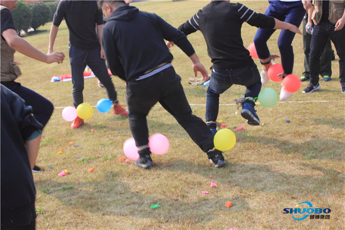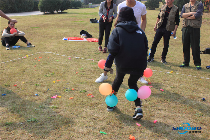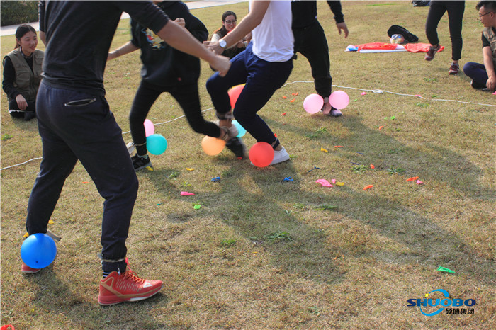 吃罷午飯,休息了一會,開始下午的活動,一開始就是比較激烈的“踩氣球”,每組出兩名隊員,腿上每個人綁四個氣球,三分鐘時間,在圈內(nèi),看最后剩余的氣球數(shù),第一輪紅隊兩名隊員比較給力,合力把其他隊都消滅了,自己剩余5個氣球,第二輪第三輪雖然戰(zhàn)績不佳,但是由于第一局的絕對優(yōu)勢,取得最終的勝利。